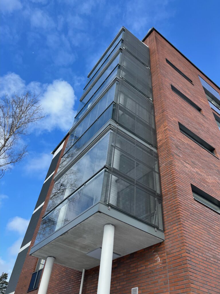 Pystysuorat kaideritilät kiinteiden parvekelasien edessä hidastavat ja vaikeuttavat ulkopintojen pesemistä.