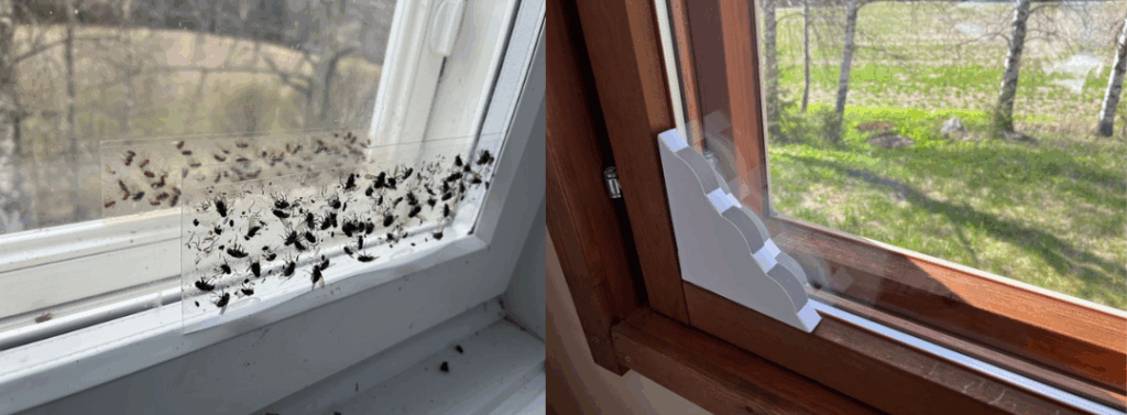 Usein markkinoilla näkee erilaisia tee-se-itse-ratkaisuja tai epäesteettisiä liimapintoja, jotka keräävät näkyvästi kuolleita kärpäsiä ja jättävät ikkunalaudat sotkuisiksi. Swissinno-kärpäspyydykset ovat huomaamattomampia ja siistimpiä – ne sulkevat kärpäset sisäänsä, pitäen ympäristön siistinä ja viihtyisänä. Alla olevista kuvista näet konkreettisen eron: